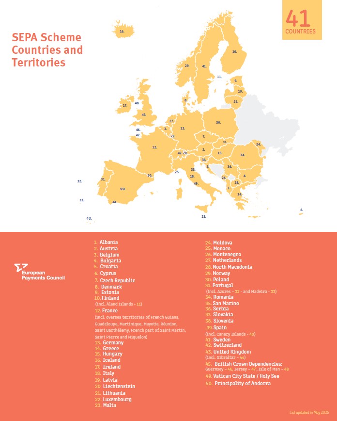 Područje SEPA-e obuhvaća 41 državu: sve članice EU-a, 3 članice EGP (Europski gospodarski prostor) te Island, Lihtenštajn, Norvešku, Švicarsku, Monako, San Marino, Crna Goru, Albaniju, Moldaviju, Srbiju i Sjevernu Makedoniju.