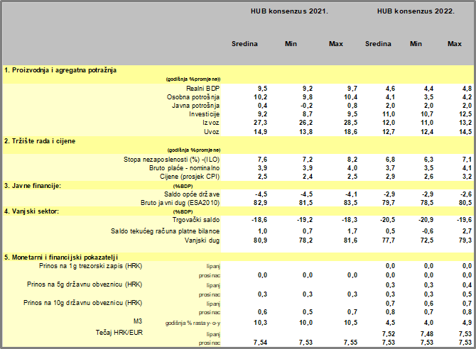 Dobra je vijest i da optimizam glavnih ekonomista hrvatskih banaka ne posustaje u pogledu 2022. godine. Prosječna očekivana stopa rasta iznosi 4,6% uz vrlo male razlike prognozera od „pesimističnih“ 4,4% do optimističnih 4,8%. Logično, ekonomisti očekuju da će se tako brz gospodarski rast preliti na tržište rada kroz smanjenje stope nezaposlenosti i rast plaća.