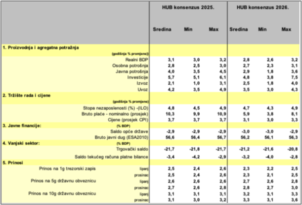 Za ovu godinu ostala je još samo jedna objava BDP-a (za zadnje tromjesečje). Brojku ćemo saznati u ožujku, a ono malo neizvjesnosti što je  do tada ostalo reflektira se u vrlo uskom rasponu procjena ovogodišnjeg rasta: od 3,0 do 3,2%. Javna potrošnja i investicije povukle su gospodarski rast. S druge strane, rast osobne potrošnje usporio je na 2,8% nakon rasta od 6,0% 2024., a izvoz je sa svega 2% realnoga rasta djelovao kao usporavatelj - ponajviše zbog pada izvoza usluga u trećem tromjesečju.