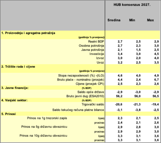 U javnosti se puno raspravljalo o mogućem tvrdom prizemljenju nakon što će iduće godine biti iskorištena sredstva europskog Mehanizma oporavka i otpornosti. Pogled na očekivanja za 2027. godinu pokazuje da tvrdog prizemljenja odnosno učinka litice – nema. Očekivani rast BDP-a od 2,7%, uz daljnji pad stope nezaposlenosti na 4,7% 2027., ukazuje na neznatno usporavanje rasta u odnosu na 2026. Doduše, u strukturi se vidi slabiji doprinos javne potrošnje (usporavanje rasta na 2,1% 2027. nakon 2,9% 2026.) i investicija (usporavanje na 3,4% 2027. nakon 4,8% 2026.). Uz nastavak rasta osobne potrošnje po očekivanoj stopi od 2,7%, izvoz je taj koji ubrzanjem rasta (3,0% 2027. nakon 2,5% 2026. i 2,1% 2025.) neutralizira učinke usporavanje rasta domaće potražnje. Potonje pronalazi odraze u nižoj stopi inflacije (2,5%) i rasta plaća (4,4%) 2027.